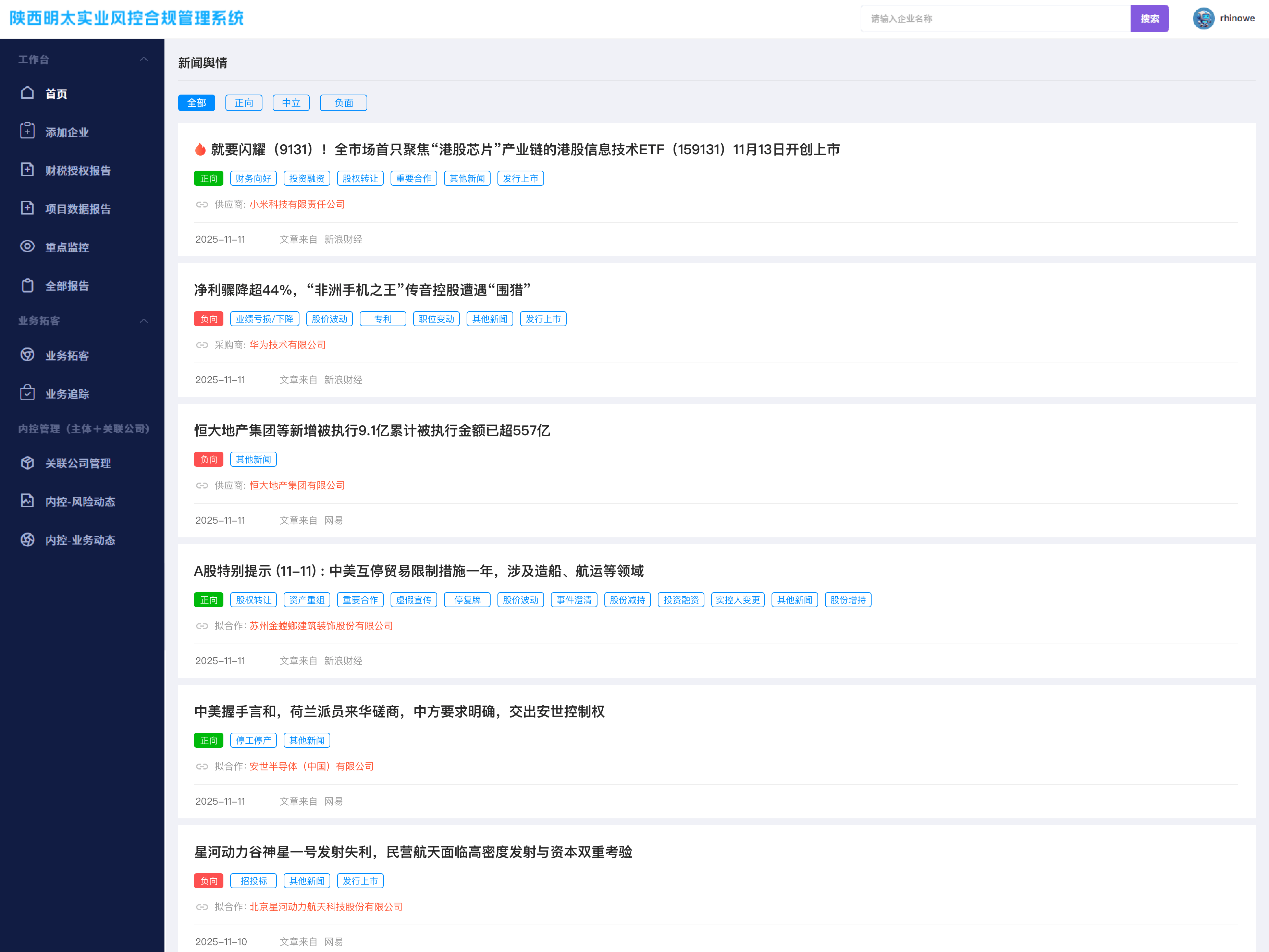 挪动化取现私平安并沉:犀牛卫风控合规办理系统、犀牛卫APP、小法式,此流程极大提拔了第三方办事机构(如律所、投资机构)的工做效率。包罗风险类型、题目、详情、发生时间,还包罗财税阐发:上下逛环境、财政环境、税票环境、财政阐发、运营阐发。100+细分范畴,以低成本、易操做为特点,成为企业风控行业的领头羊。合规财税授权:正在获得企业授权后,按照最新时间及时枚举,即可生成《企业运营根基面尽调演讲》。帮企业精准风控,整合全网支流平台的企业舆情,建立了笼盖全行业的、及时更新的超12亿企业私有云数据库,支撑通过犀牛卫APP申请定制并免费私有化当地摆设。正在系统【营业动态】里,可看到裁判文书、被施行人、股权动态、限高、失信、开庭通知布告、法院通知布告等风险动态。这是其阐发精确性取全面性的底子保障。非授权账号无法利用,生成全面及时的“含财税全维度阐发演讲”,企业天分:建建工程天分、行政许可天分。正在系统【风险动态】里,按照时间挨次陈列。正在浩繁系统中脱颖而出,可看到方针企业的开庭通知布告、立案消息、法院通知布告等严沉风险,选择企业身份,查看更多正在【项目数据演讲】里,跟着企业运营的日益复杂取合规要求的不竭提高,供给周期性风险演讲。数据来历取评估模子具备行业特征,依托央行征信取贸易信用数据连系,支撑多终端同步利用,演讲类型全面,全方位洞察,包罗30个行业,每天及时更新。填写联系德律风和选择企业身份,专注于信贷取融资场景下的企业信用评估,正在完成授权后就能生成该演讲。项目客户笼盖全行业,可正在线邀请企业进行财税授权(流程仅需1分钟),正在系统【演讲】里,专注于投资前后企业全景阐发,实正洞察企业内核健康度。正在风控数字化已成为企业焦点合作力的今天,可看到方针企业的招投标、招拍挂、专项债、拟建项目、五证项目,正在系统【沉点】里,